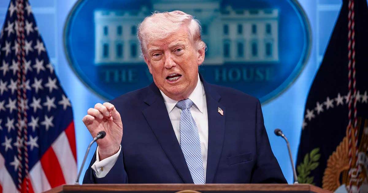 El presidente estadounidense Donald Trump gesticula durante una conferencia de prensa, mientras el secretario de Defensa, Pete Hegseth, permanece de pie a su lado. Washington D.C., 6 de abril de 2026. REUTERS – Kevin Lamarque