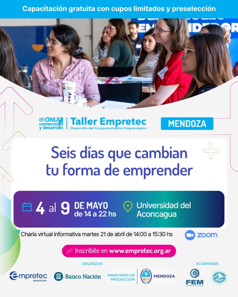 El Ministerio de Producción del Gobierno de Mendoza, junto a Fundación Empretec, la Universidad del Aconcagua y la Federación Económica de Mendoza, impulsa una nueva edición del Taller de Desarrollo del Comportamiento Emprendedor (DCE) – UNCTAD | Empretec, una propuesta formativa de alcance internacional orientada a fortalecer habilidades fundamentales para el desarrollo empresarial.