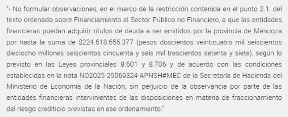 “No formular observaciones a que las entidades financieras puedan adquirir títulos de deuda a ser emitidos por la provincia de Mendoza por hasta la suma de $224.618.656.377“, dice la Comunicación “A” 8213/2025 del Banco Central de la República Argentina (BCRA) publicada este lunes en el Boletín Oficial de la Nación.