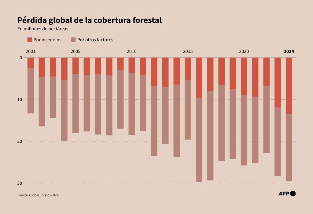 Esta cifra, en aumento del 80% respecto a 2023, equivale a «la pérdida de 18 canchas de fútbol por minuto», señaló Elizabeth Goldman, investigadora de Global Forest Watch.