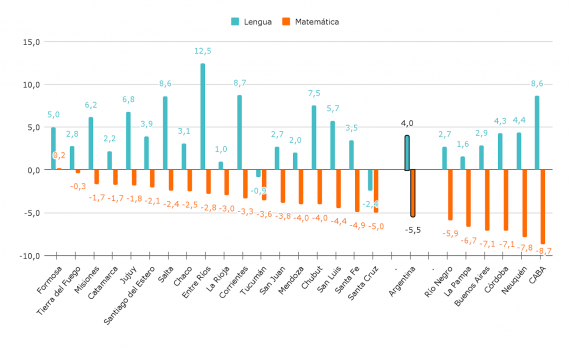 En la provincia los datos siguen la tendencia nacional: en Lengua pasó del 61% de estudiantes con nivel satisfactorio o avanzado en 2022 al 64% en 2024. Mientras que en Matemática: cayó del 20% en 2022 al 16% en 2024.